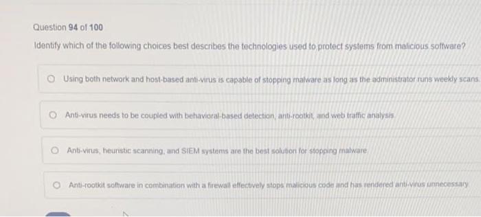 Question 94 of 100 Identify which of the following choices best describes the technologies used to protect systems from malicious sofware. All known rainbow tables values are tried. All possible combination of characters are tried c.